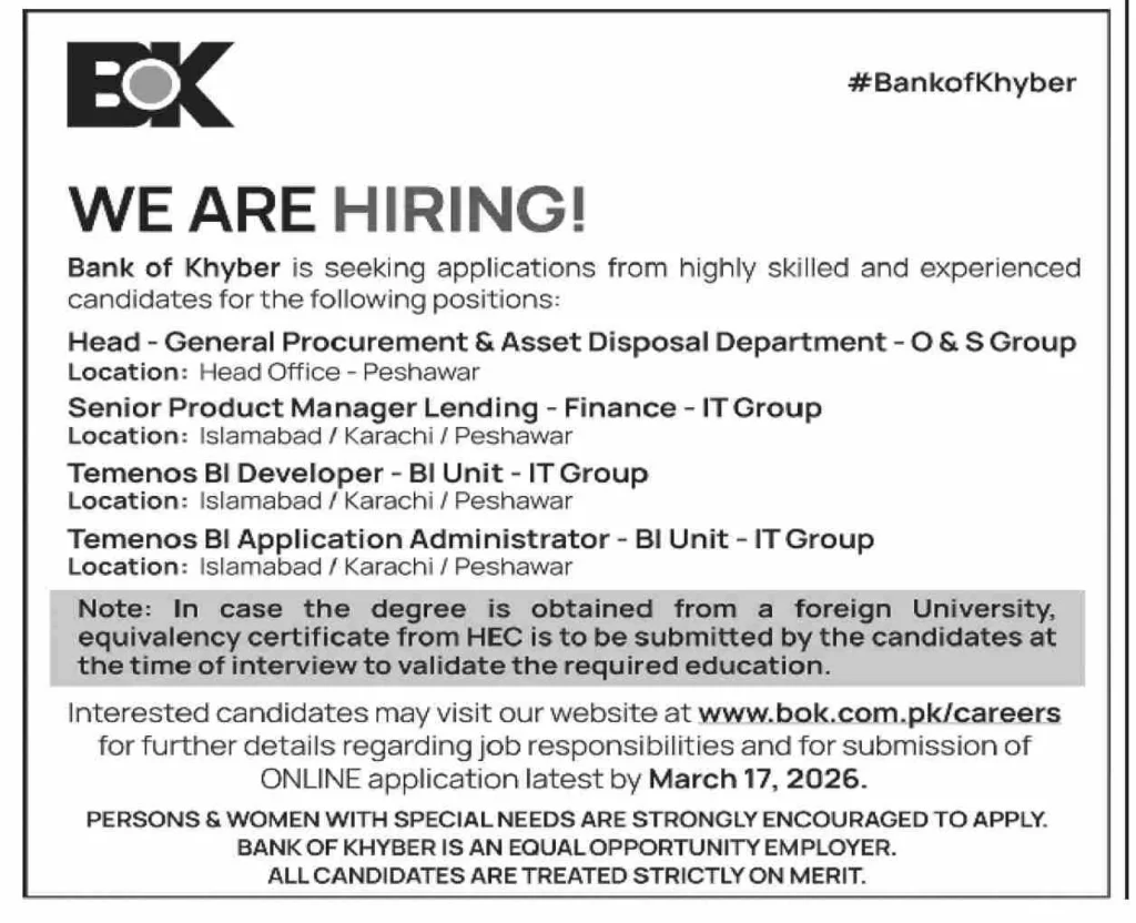 Bank of Khyber (BOK) has announced new recruitment opportunities for experienced professionals in management, procurement, lending product development, and banking technology. The hiring covers positions at the Head Office in Peshawar as well as multi-city placements in Islamabad, Karachi, and Peshawar. This recruitment reflects the bank’s continued focus on strengthening its operational governance, digital banking systems, and enterprise reporting infrastructure.