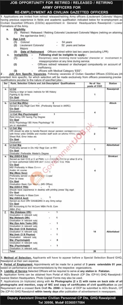 GHQ Rawalpindi Jobs 2026 – Civilian Gazetted Officer Vacancies for Retired Army Officers