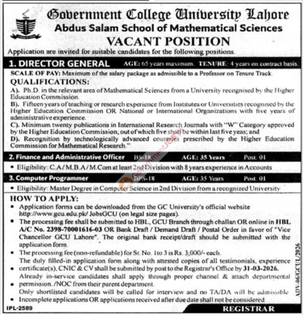Government College University (GCU) Lahore has announced new academic, administrative, and technical career opportunities for 2026 at the Abdus Salam School of Mathematical Sciences (AS-SMS). This focused recruitment includes one senior academic leadership role and two BS-18 level support positions. These jobs are suitable for highly qualified professionals in mathematical sciences, finance administration, and computer science who want to work in a prestigious public sector university environment.