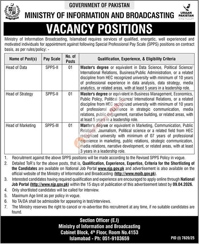 Ministry of Information and Broadcasting Jobs 2026 are not routine government vacancies. These positions are designed for senior professionals capable of working at national policy level in areas such as data strategy, communication planning, and public narrative development. Unlike traditional clerical or administrative hiring, these SPPS (Special Professional Pay Scale) roles focus on expertise, leadership ability, and proven professional performance.