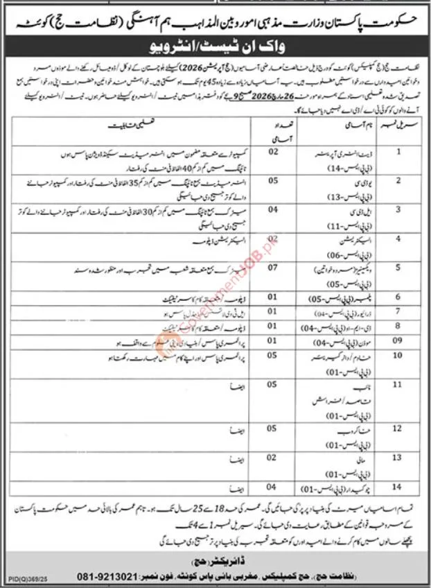 The Ministry of Religious Affairs & Interfaith Harmony, Government of Pakistan, has announced a walk-in recruitment drive for 41 BPS-level government positions in Quetta, Balochistan, offering direct hiring opportunities for Assistant, Upper Division Clerk, Lower Division Clerk, Electrician, Driver, and various support staff roles through a transparent test/interview process at the Hajj Complex, Western Bypass.