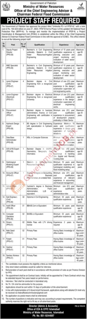 Ministry of Water Resources Islamabad Jobs 2026 – Federal Flood Commission Project Staff Vacancies (PPS-01 to PPS-09)