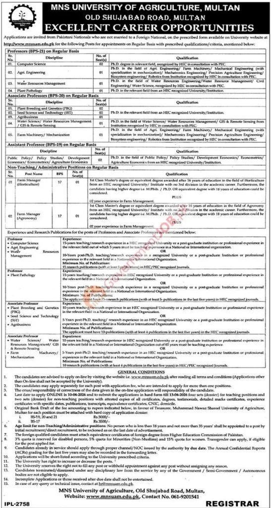 MNS University of Agriculture, Multan has announced regular recruitment for faculty and administrative positions including Professor, Associate Professor, Assistant Professor, and Farm Manager roles across disciplines such as Computer Science, Agricultural Engineering, Water Resource Management, Plant Sciences, Agribusiness, GIS & Remote Sensing, and Agricultural Economics, with applications invited via the official university portal until April 13, 2026.