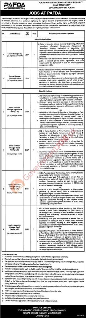 PAFDA Jobs 2026 – Punjab Agriculture Food & Drug Authority Senior Management & Technical Recruitment Guide