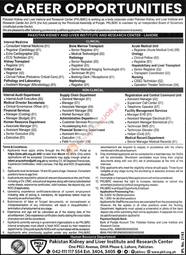 Pakistan Kidney and Liver Institute and Research Center (PKLI&RC), Lahore has announced a large-scale recruitment drive for 2026, offering a wide range of clinical and non-clinical vacancies across its hospital and support services departments. As one of Pakistan’s most modern tertiary-care healthcare institutions, PKLI&RC is inviting applications from qualified professionals who are committed to patient safety, service quality, and operational excellence.