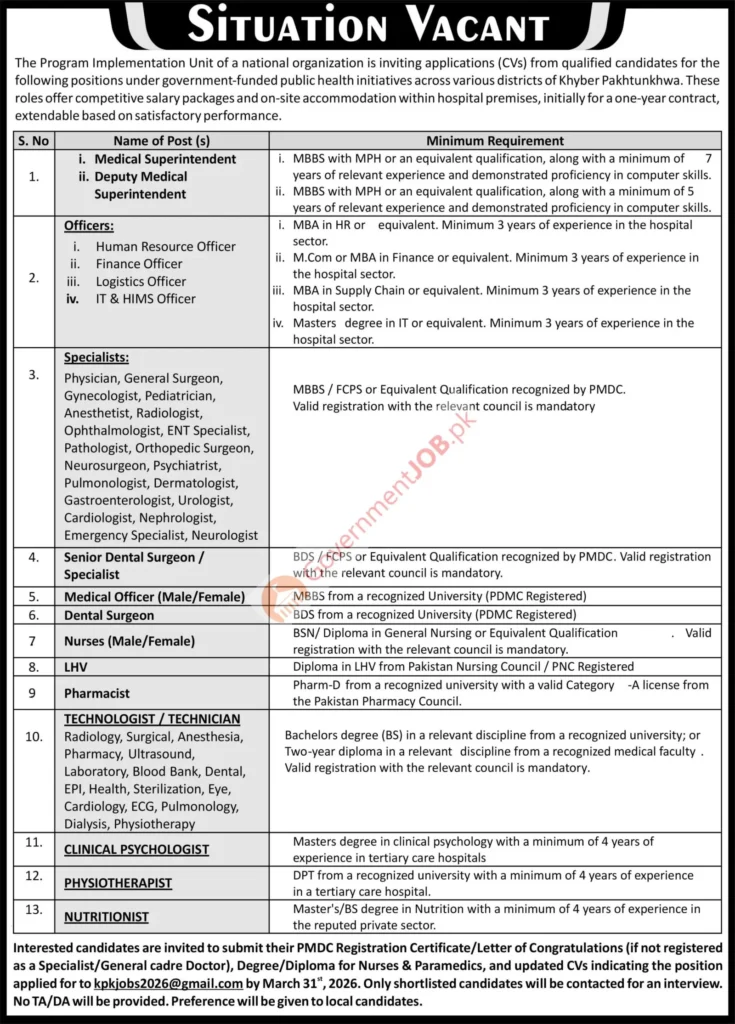 Program Implementation Unit Public Health Jobs 2026 – Doctors, Nurses & Hospital Staff Vacancies in KPK