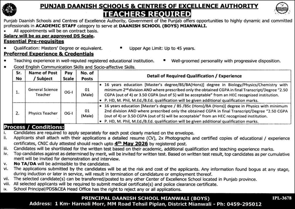 Punjab Daanish Schools & Center Of Excellence Authority (PDS&CEA) has announced teaching vacancies in Mianwali through an advertisement published in Daily Express on 17 April 2026. The authority is seeking qualified educators for various teaching positions including: