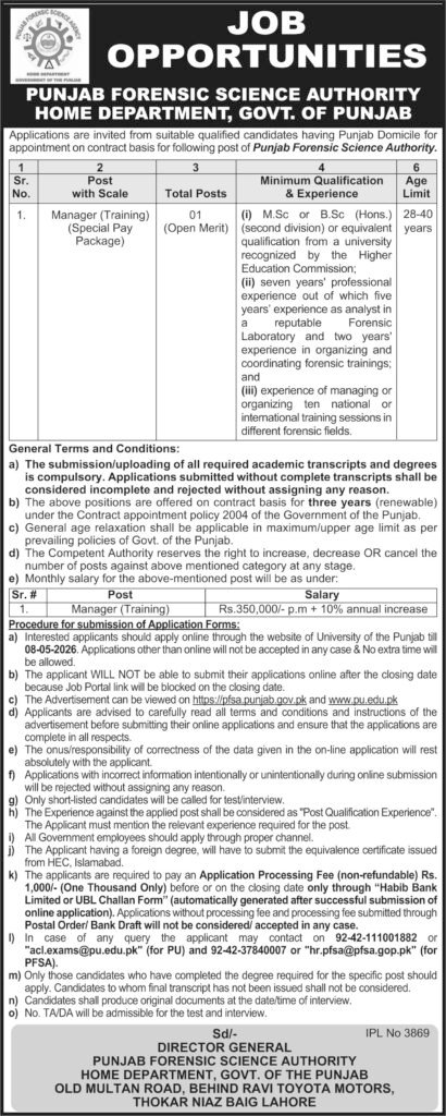 The Punjab Forensic Science Agency (PFSA) stands as a cornerstone of justice and investigation within the province of Punjab. Recognizing the growing complexity of forensic challenges, the agency has initiated a specialized recruitment drive to strengthen its administrative and operational leadership. On 21 April, 2026, an official notification was released in the Business Recorder newspaper inviting qualified professionals to join their team at their headquarters in Thokar Niaz Baig, Lahore.