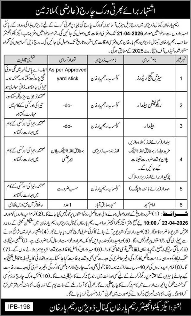 Rahim Yar Canal Division, Irrigation Department has announced job vacancies in Rahim Yar Khan and Sadiqabad, Punjab, Pakistan. These positions were advertised in the daily Express dated 17 April 2026 and are open to eligible candidates with Primary or Intermediate education.