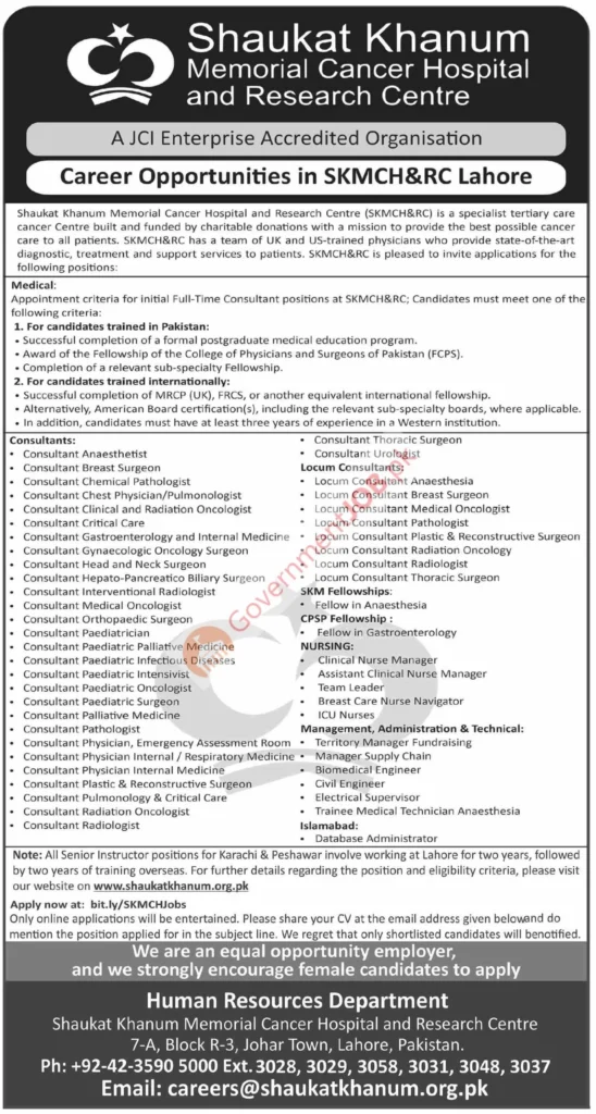 Shaukat Khanum Memorial Cancer Hospital and Research Centre (SKMCH&RC), Lahore—a JCI Enterprise Accredited Organisation—has announced multiple career opportunities for qualified medical, nursing, fellowship, and management professionals to join its charitable tertiary care cancer centre.