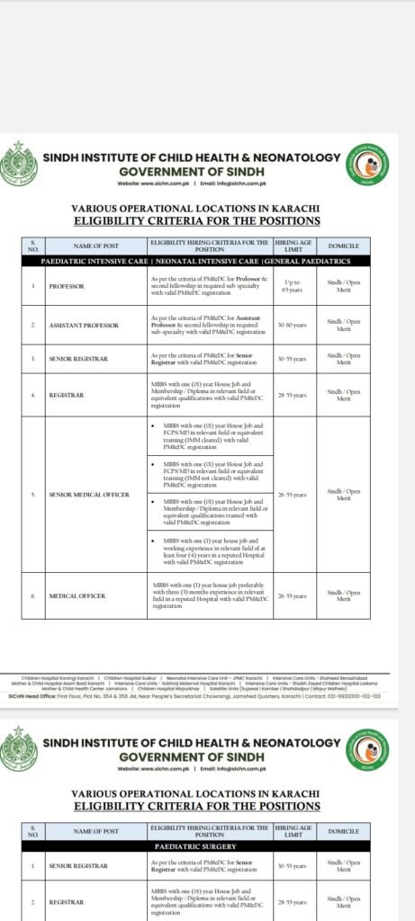 SICHN operates specialized children’s hospitals, neonatal intensive care units (NICUs), and maternal health centers across Sindh. The current recruitment covers fifteen major departments with varying eligibility criteria based on PM&DC regulations and HEC-recognized qualifications.
