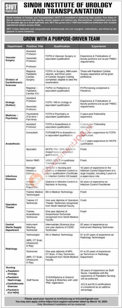 SIUT Jobs 2026 – Sindh Institute of Urology & Transplantation (Karachi & Sukkur) – Faculty, Nursing, Technologists & Allied Health Positions