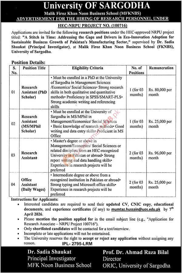 The University of Sargodha, through Malik Firoz Khan Noon Business School (MFKNBS), has announced project-based research positions under an HEC-approved National Research Program for Universities (NRPU) project, inviting applications from qualified scholars and professionals in Management Sciences, Economics, and Social Sciences for short-term research assignments with competitive monthly stipends until April 7, 2026.