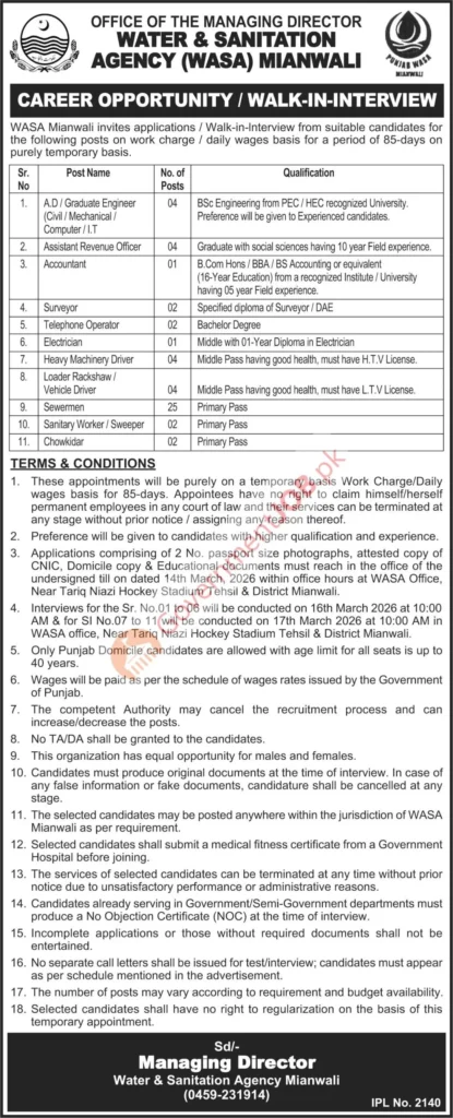 The Office of the Managing Director, Water & Sanitation Agency (WASA) Mianwali, has announced a special recruitment drive for Pakistani nationals (Punjab domicile holders) through walk-in interviews. The advertisement, published on February 28, 2026, invites applications for multiple positions on a work charge / daily wages basis for a purely temporary period of 85 days. These vacancies are based in Mianwali, Punjab, and candidates may be posted anywhere within the WASA Mianwali jurisdiction as per operational requirements.